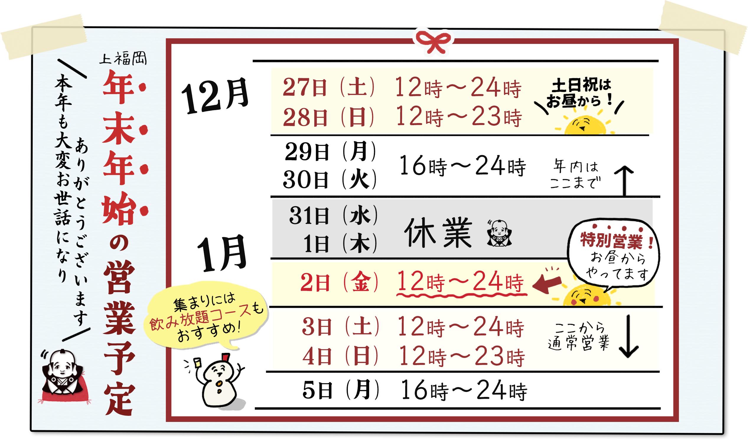 早いものでもうすぐ年末年始!上福岡クラフトダイニングでは、